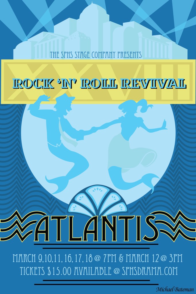 When designing this piece, I wanted to harken back to the show’s roots while very clearly conveying that year’s selected theme. I’d been going with my family to see Rock ‘n’ Roll since I was in elementary school, so it was very important to me that the history and legacy of the almost thirty-year old show was represented in my design. I ended up building the composition around two dancing mermaids, posed similarly to the dancing sock-hop couple from the original Rock ‘n’ Revival poster, to help tie the show’s history into that year’s underwater theme.